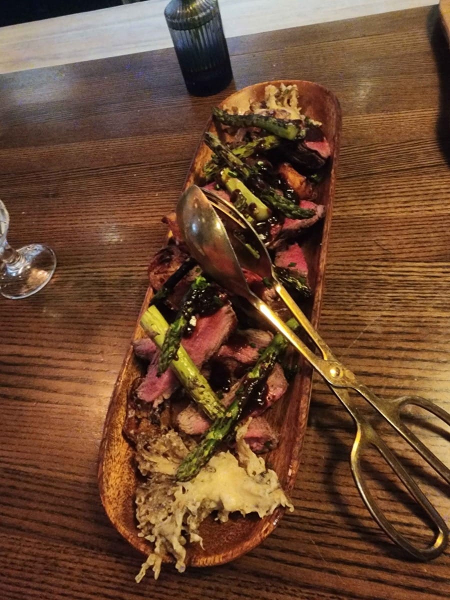 Here’s another insult: our menus are still on our table when the entree arrives. No one has bothered to clear them. I’ve stacked them up neatly within arm’s reach of the register the bar staff keeps congregating near, but no one seems to care to clear them away. We just leave them there as we finally begin eating – the beef is delicious, succulent and cooked to a beautiful medium rare, seasoned just right, with a char that crunches pleasantly between my teeth and brings a much needed bitter smokiness. The asparagus accompanying it is inconsistently cooked, the crispy truffle potatoes (sigh) are yummy but I have to force myself to finish one, and the two tempura maitake mushrooms adorning the platter are delightful. I’d hoped there would be enough jus on the plate to justify swiping the sourdough through, but just like so much else at Le Mazet, I end up disappointed and let down.